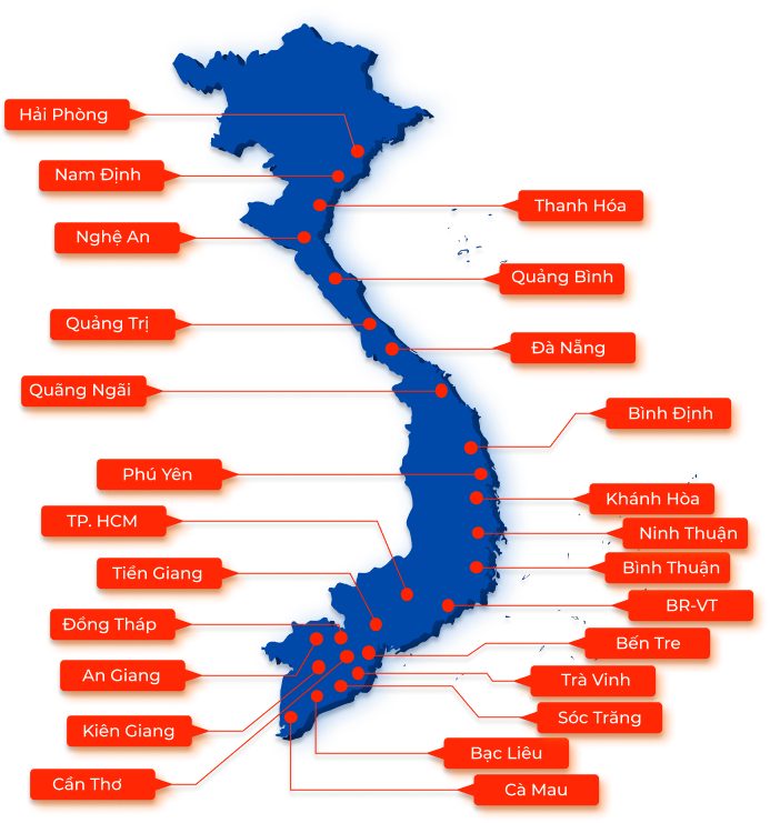 Chúng tôi xây dựng mạng lưới phân phối khắp cả nước, tập trung chủ yếu trải dài dọc các tỉnh ven biển, giúp sản phẩm luôn sẵn sàng tại những khu vực có hoạt động đánh bắt mạnh.